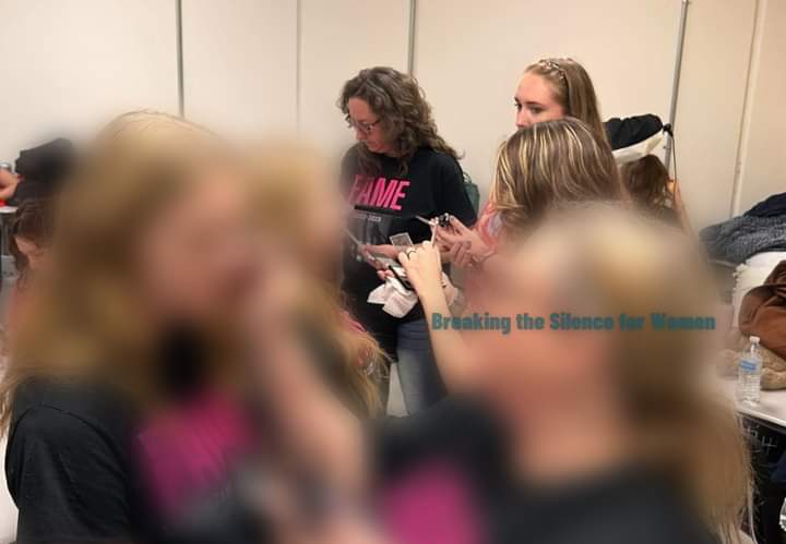 [Photo credit to C.A.] Pictured is me, at center, and my daughter from the nose up, as we helped the girls in my son’s show choir get stage-ready before their performance last weekend.