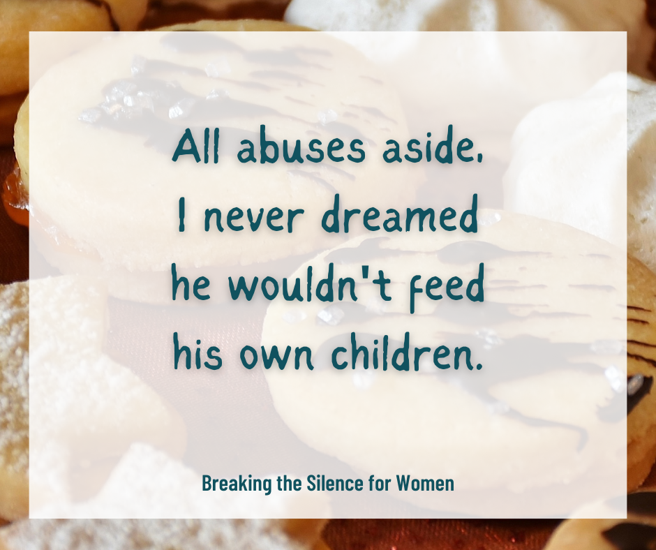 Last night my daughter, who is now 20, told me about the cookies for the first time. She said that after I moved us out, their dad didn’t keep or prepare food for them at the house I’d left behind. Just a cabinet full of cookies he’d bought in bulk.